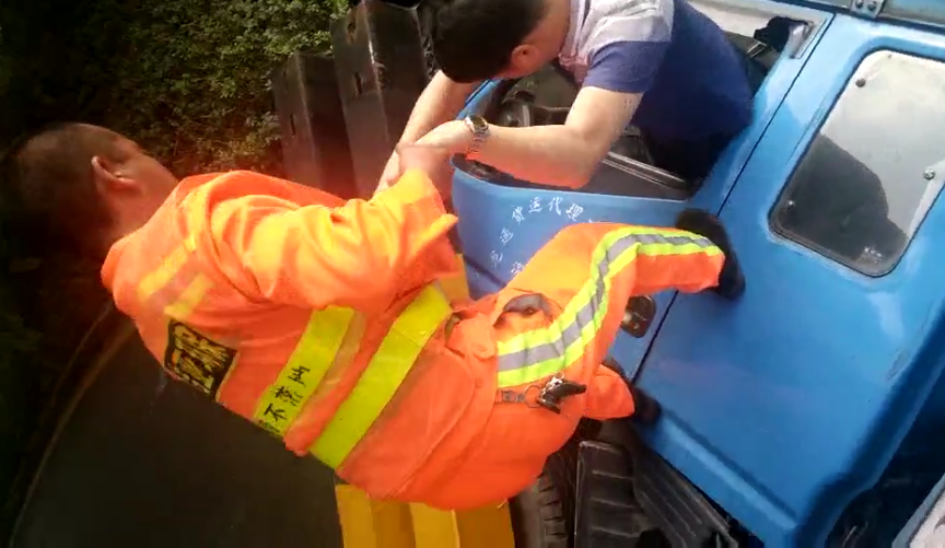 仔細(xì)詢問后,小編才得知,原來,今天一早李產(chǎn)糧和周樹波像往常一樣在路面作業(yè),當(dāng)灑水車作業(yè)到鹽龍大道輔道時(shí),一陣刺耳的剎車聲從不遠(yuǎn)處傳來,緊接著一個(gè)轉(zhuǎn)彎,“砰”的一聲,一輛藍(lán)色貨車直直撞上綠化帶,側(cè)翻在了馬路邊......此時(shí)正是車輛密集的時(shí)段,路上過往的車輛不少,但是因?yàn)椴幻髑闆r,大家都并未停下車,目睹了車禍的兩人嚇了一大跳,緩過神來后兩人想也沒想,急急忙忙跳下車去救人。